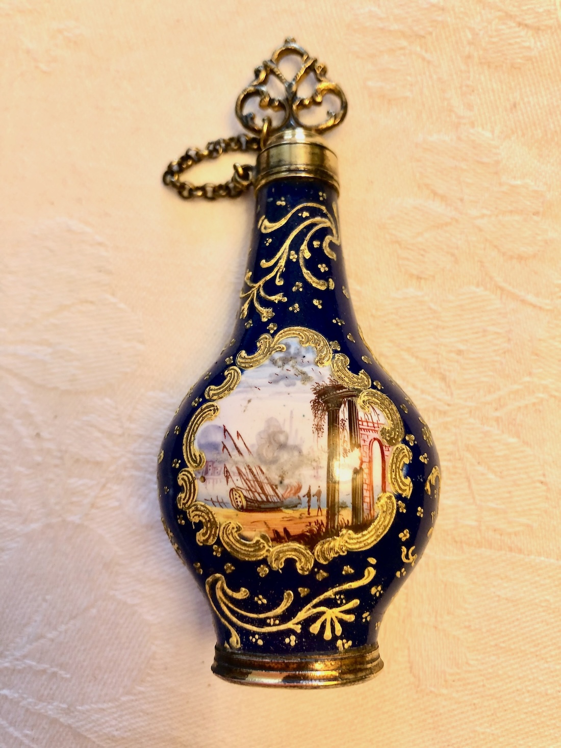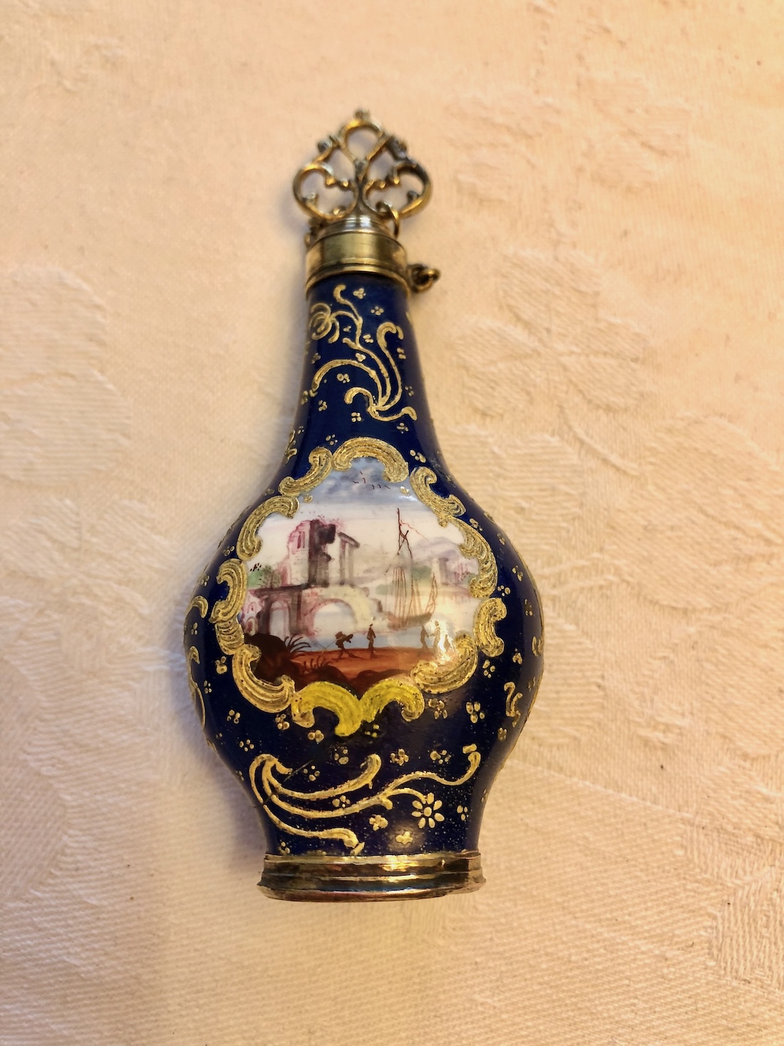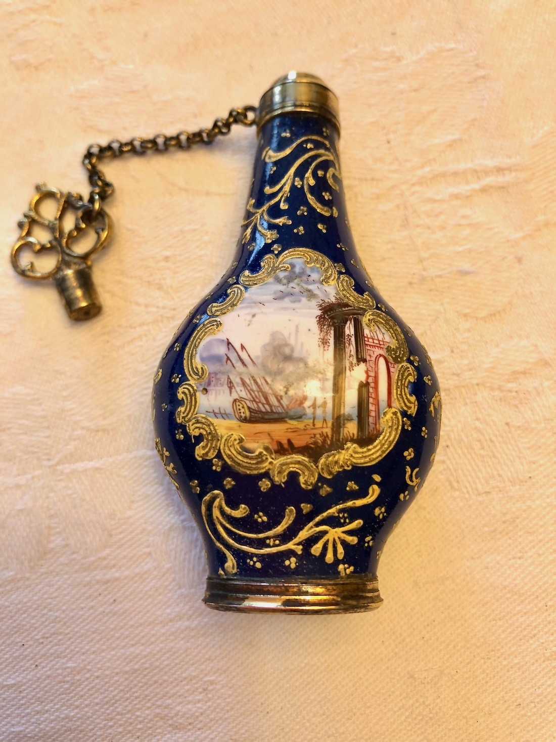 A charming small enamel scent bottle measuring 8.8cm high. Both sides of the scent bottle are painted with harbour scenes on a royal blue ground. Surrounding the central painting are scrolls in gold with tiny flowers. The top has a gilt metal collar and the stopper is pierced with a small chain attached to the collar. A lovely piece. It is in good condition but there is some age related wear and a scratch on the bottom left.